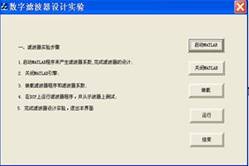圖2 (4)按下SW101按鈕選擇DSP工作的程序,當(dāng)程序號(hào)模塊顯示“1”時(shí),即可以進(jìn)行在線設(shè)計(jì)程序。當(dāng)程序號(hào)模塊顯示“2”時(shí),可以通過觀測DSP產(chǎn)生的各種信號(hào)波形。 2.在線設(shè)計(jì) 運(yùn)行YL-XH1B主程序.exe,即打開本配套軟件的主程序,如圖3所示,雙擊界面,則出現(xiàn)在線設(shè)計(jì)實(shí)驗(yàn)選擇界面,如圖4所示。包含4種實(shí)驗(yàn)選擇。 2.1濾波器設(shè)計(jì) 在“信號(hào)與系統(tǒng)在線設(shè)計(jì)程序”界面上選擇“濾波器設(shè)計(jì)”,即可以通過MATLAB設(shè)計(jì)濾波器系數(shù),并加載到DSP中運(yùn)行,通過實(shí)驗(yàn)箱測試濾波器的特性。界面如圖5所示。界面上介紹了操作步驟,并包含“啟動(dòng)MATLAB”、“關(guān)閉MATLAB”、“裝載”、“運(yùn)行”、“結(jié)束”等按鈕。 (1)“啟動(dòng)MATLAB”,自動(dòng)調(diào)用MATLAB,通過MATLAB完成濾波器的設(shè)計(jì),并產(chǎn)生相應(yīng)的濾波器系數(shù)。 (2)“關(guān)閉MATLAB”,關(guān)閉MATLAB的濾波器設(shè)計(jì)界面。 (3)“裝載”,將實(shí)現(xiàn)濾波器的DSP代碼和濾波器系數(shù)加載到實(shí)驗(yàn)箱中的DSP中。 (4)“運(yùn)行”,運(yùn)行DSP中的濾波器程序,并在相應(yīng)的測試點(diǎn)測試濾波器的性能。 (5)“結(jié)束”,結(jié)束濾波器設(shè)計(jì)實(shí)驗(yàn),退出該實(shí)驗(yàn)界面。