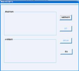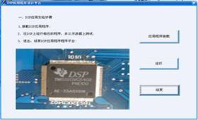 圖6 (1)“加載原始信號(hào)”, 從PC機(jī)上選擇定制好的信號(hào),將DSP程序代碼和該信號(hào)數(shù)據(jù)加載到實(shí)驗(yàn)箱的DSP中。同時(shí)在界面左邊的原始信號(hào)波形區(qū)域顯示該信號(hào)的時(shí)域波形。 (2)“運(yùn)行”,運(yùn)行DSP中的頻譜分析程序,可以通過在實(shí)驗(yàn)箱的測試點(diǎn)上觀測。 (3)“實(shí)時(shí)分析”,將DSP中的頻譜分析的結(jié)果采集到計(jì)算機(jī)上,在界面左邊的DFT頻譜波形區(qū)域顯示出該信號(hào)的頻譜。 (4)“結(jié)束”,結(jié)束頻譜分析實(shí)驗(yàn),退出該實(shí)驗(yàn)界面, 2.3 DSP應(yīng)用 在“信號(hào)與系統(tǒng)在線設(shè)計(jì)程序”界面上選擇“DSP應(yīng)用”按鈕,出現(xiàn)DSP應(yīng)用實(shí)驗(yàn)平臺(tái)界面,如圖7所示。該實(shí)驗(yàn)通過PC機(jī)將自主編寫的DSP應(yīng)用程序加載到實(shí)驗(yàn)箱的DSP中運(yùn)行,可不用仿真器?!邦l譜分析實(shí)驗(yàn)平臺(tái)”包含“應(yīng)用程序裝載”、“運(yùn)行”、“結(jié)束”等按鈕,以及原始信號(hào)波形、DFT頻譜波形兩
