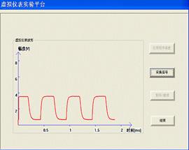 圖8 在虛擬儀表界面的左邊是測量的信號(hào)波形,橫坐標(biāo)為時(shí)間(單位為毫秒),縱坐標(biāo)為信號(hào)的幅度(單位為伏特)。進(jìn)行虛擬儀表的測試實(shí)驗(yàn)時(shí),需要將測試的信號(hào)連接到實(shí)驗(yàn)箱的P101輸入端。圖9是我們對(duì)實(shí)驗(yàn)箱中的一個(gè)方波通過虛擬儀表實(shí)驗(yàn)而獲得信號(hào)波形。圖10是該信號(hào)通過實(shí)驗(yàn)箱的一個(gè)一階RC電路之后的輸出波形。