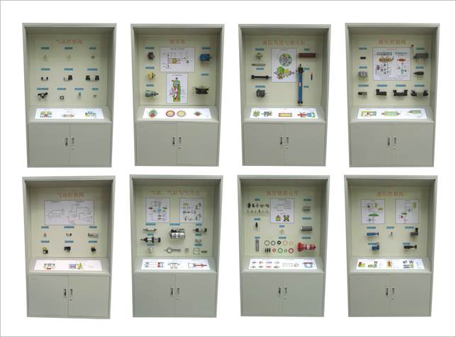 氣動(dòng)液壓示教陳列柜是為了滿足大、中院校的教學(xué)需要,根據(jù)相關(guān)教材編制設(shè)計(jì)的現(xiàn)代教學(xué)設(shè)備,其中主要以實(shí)物或模型以及必要的圖文資料展示氣缸,控制閥,液壓泵,馬達(dá),控制閥等相關(guān)元件的基本類型與基本結(jié)構(gòu)。