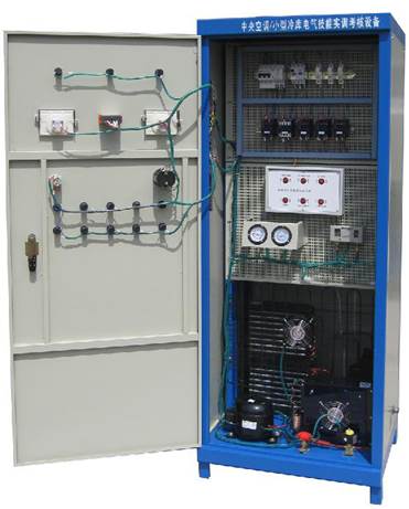 實訓(xùn)設(shè)備采用雙面柜設(shè)計,一面為中央空調(diào)電氣控制系統(tǒng),一面為小型冷庫電氣控制系統(tǒng),根據(jù)中央空調(diào)及小型冷庫電氣控制線路的要求裝置了漏電開關(guān)、熔斷器、交流接觸器、壓力控制器、電磁閥、按鈕及指示儀表等控制器件,并設(shè)置了十幾項小型冷庫系統(tǒng)的常見故障。適應(yīng)于職業(yè)院校、技工學(xué)校等用于制冷專業(yè)進行中央空調(diào)及小型冷庫系統(tǒng)控制線路的操作、故障演示及排除等教學(xué)實訓(xùn)。