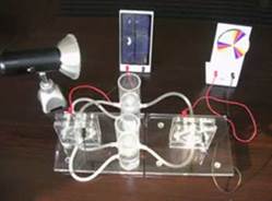 燃料電池教學(xué)模型是利用光線照射在太陽(yáng)能電池板上產(chǎn)生電能,然后利用產(chǎn)生的電能作用在電解電池模塊上,使水發(fā)生電解產(chǎn)生氫氣和氧氣。氫氣和氧氣進(jìn)入到發(fā)電模塊產(chǎn)生電能,帶動(dòng)風(fēng)扇轉(zhuǎn)動(dòng)。